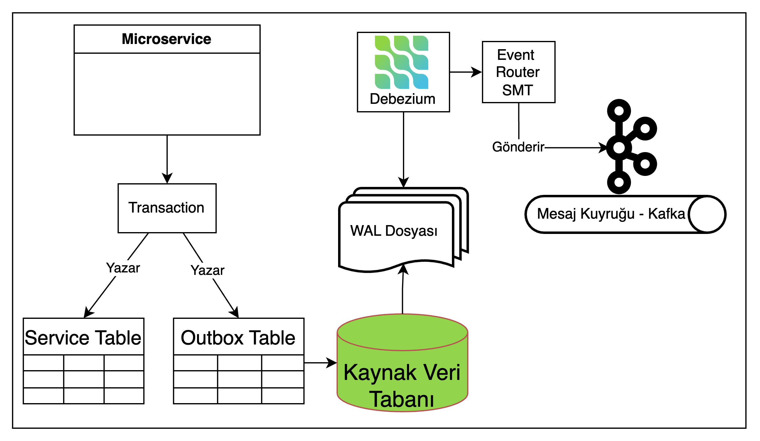 Debezium ile Outbox Pattern yaklaşımında Outbox Tablosu akıştan tamamen çıkarılabilir. Ancak gerçekleştirme kolaylığı açısından bir Outbox Tablosu’nun varlığı yine de tercih edilmektedir.
