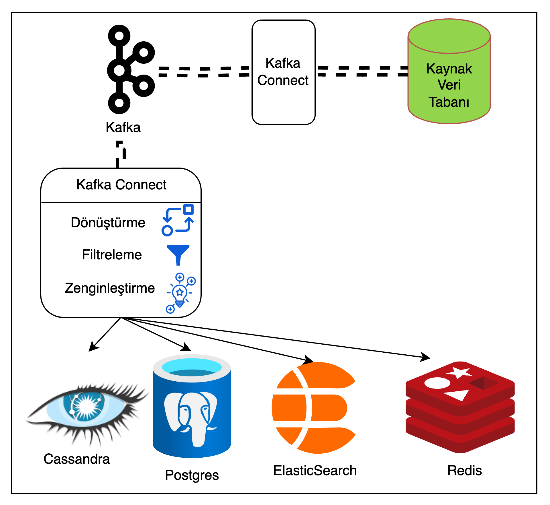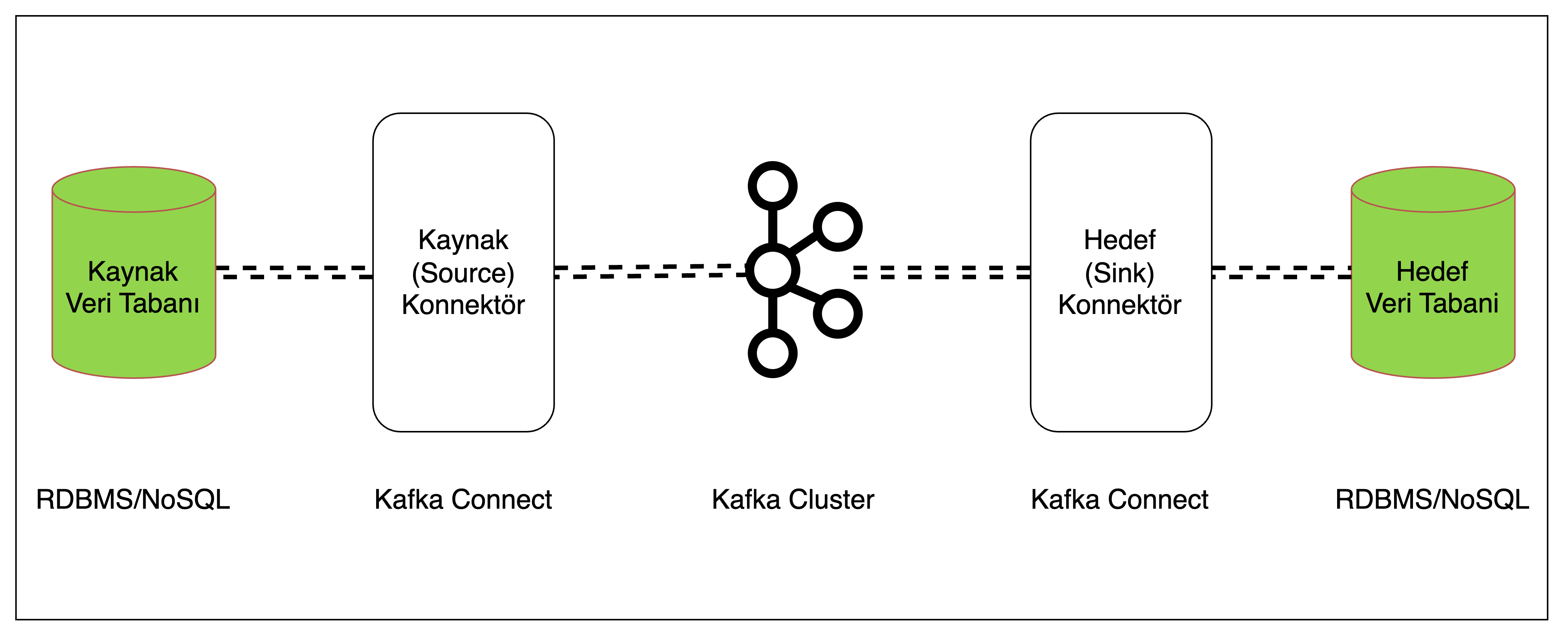 Veri aktarımında Kafka Connect yaklaşımı ise; bir kaynak veri tabanından, veriyi gerçek zamanlı olarak Kafka’ya ve yine Kafka’dan gerçek zamanlı olarak bir hedef veri tabanına aktarmaya olanak tanır. Hem kaynaktan Kafka’ya iletme hem de Kafka’dan hedef veri tabanına iletme sırasında veri dönüştürülebilir, filtrelenebilir ve zenginleştirilebilir.