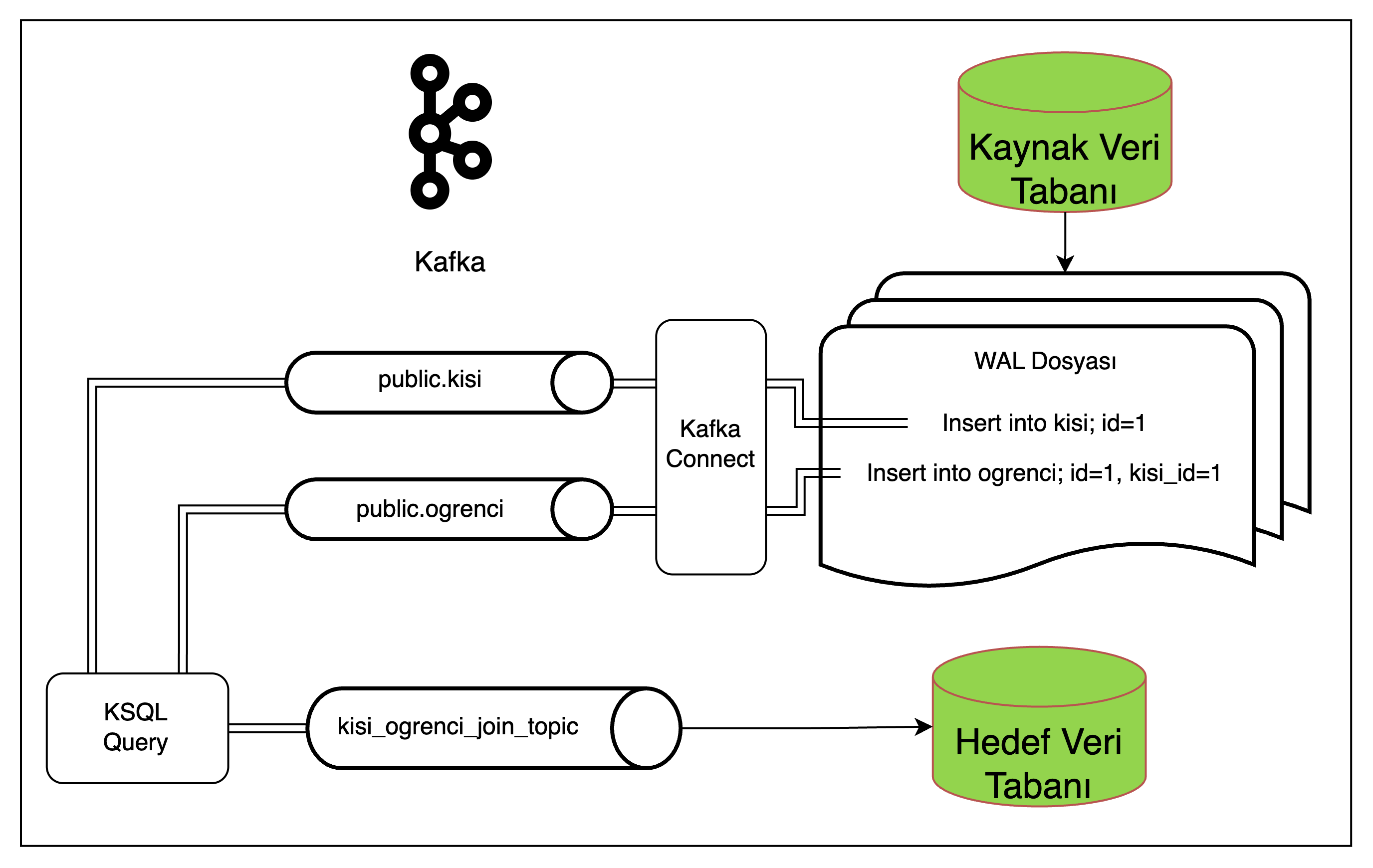 Akışta person ve student tablolari KSQL ile joinlenerek; iki verinin birleştirilmiş halini içeren 3. bir topice yönlendirilmektedir. Böylece hedef veri tabanında joinlenmiş yapıdan iliskişel veriler ayrıştırılıp ilgili tablolara kaydedilebilir.