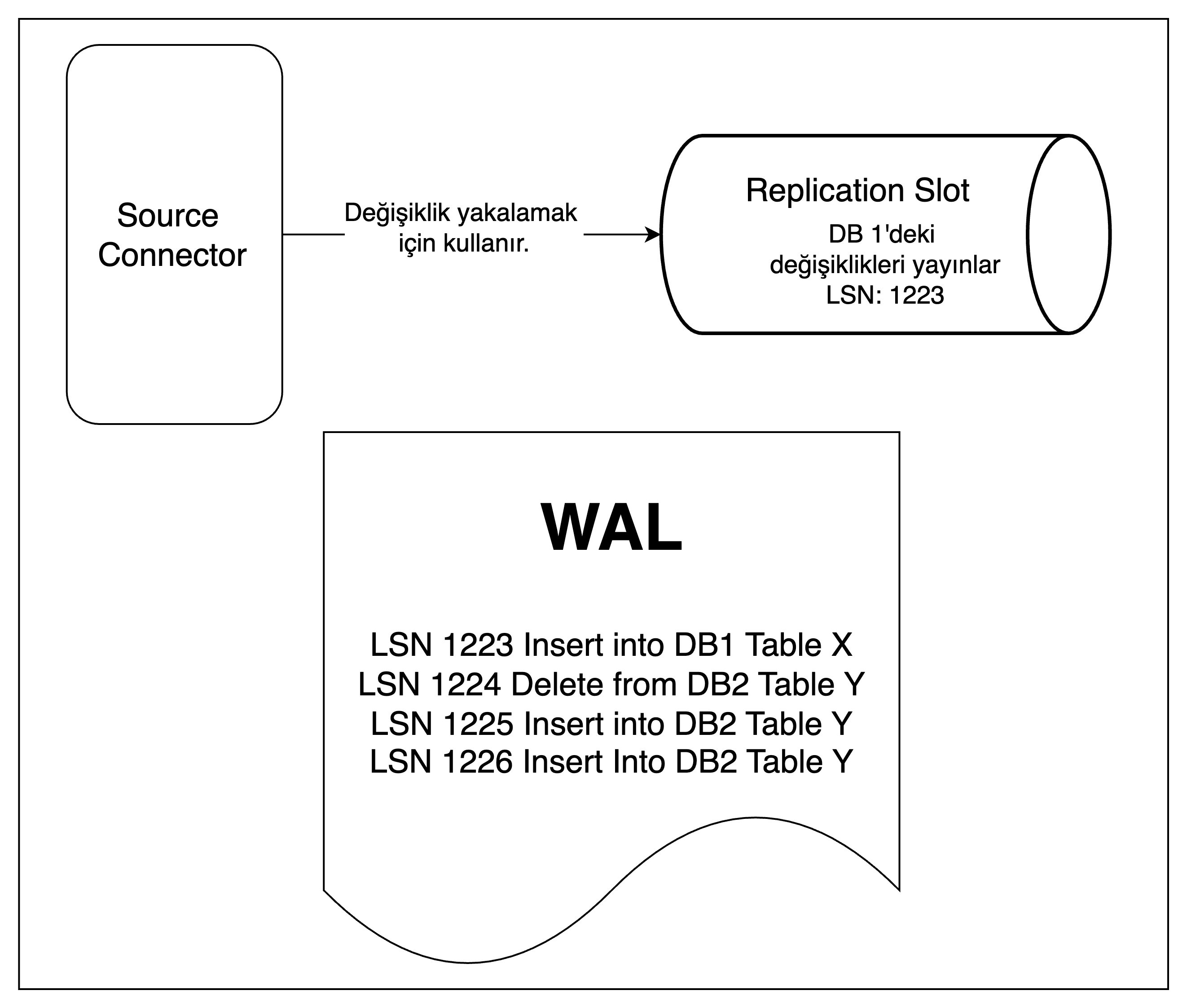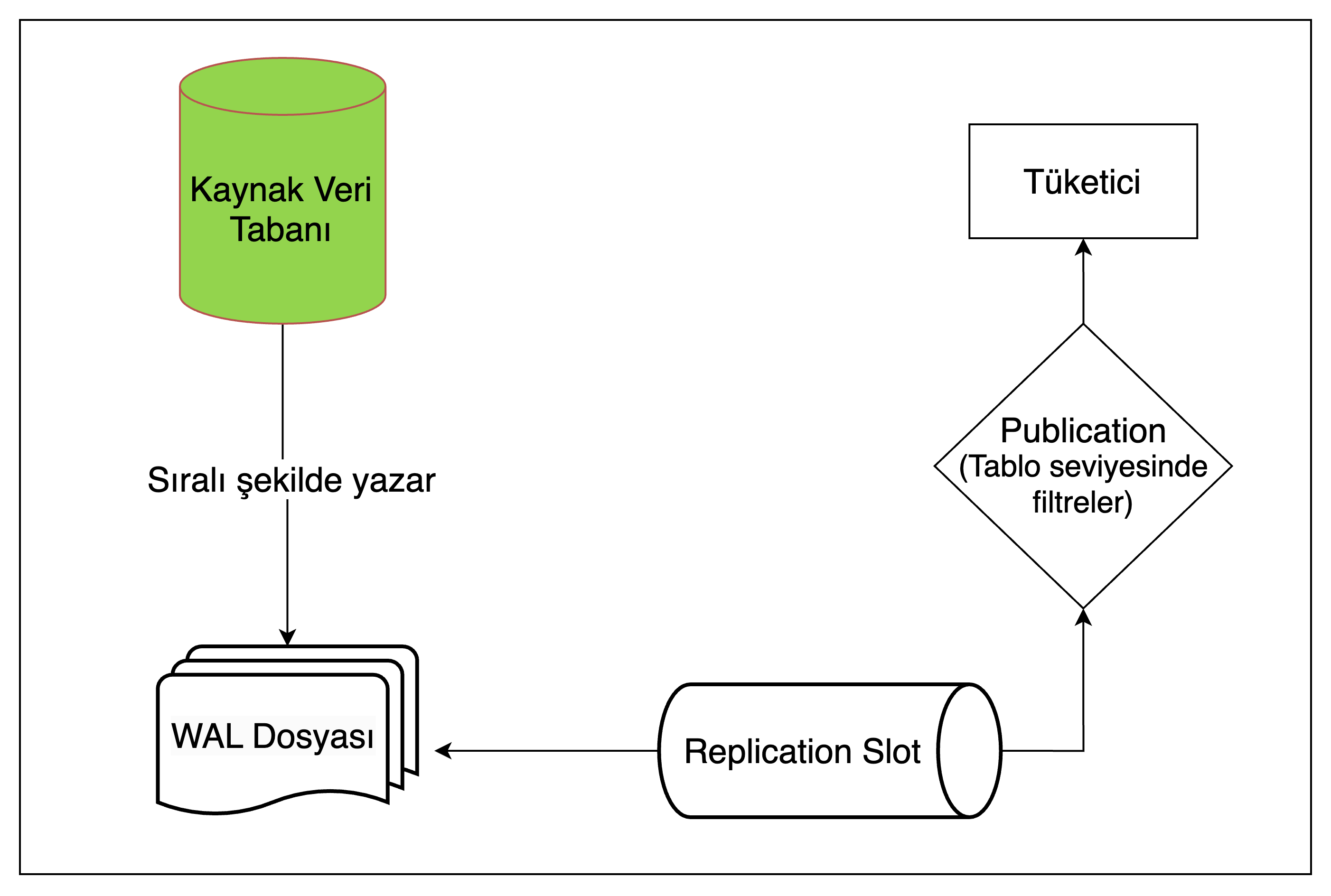 Logical: Replicanın sunduğu tüm özellikleri sunmanın yanında verileri tüm detaylarıyla harici sistemlere aktarabilmek için gerekli ekstra bilgilerin de log dosyasına yazıldığı moddur. Bu modda WAL dosyası üzerinde logical decoding yapılarak satır seviyesi değişiklikler okunabilir formatta alınabilir ve istenilen harici sistemlere aktarılabilir.