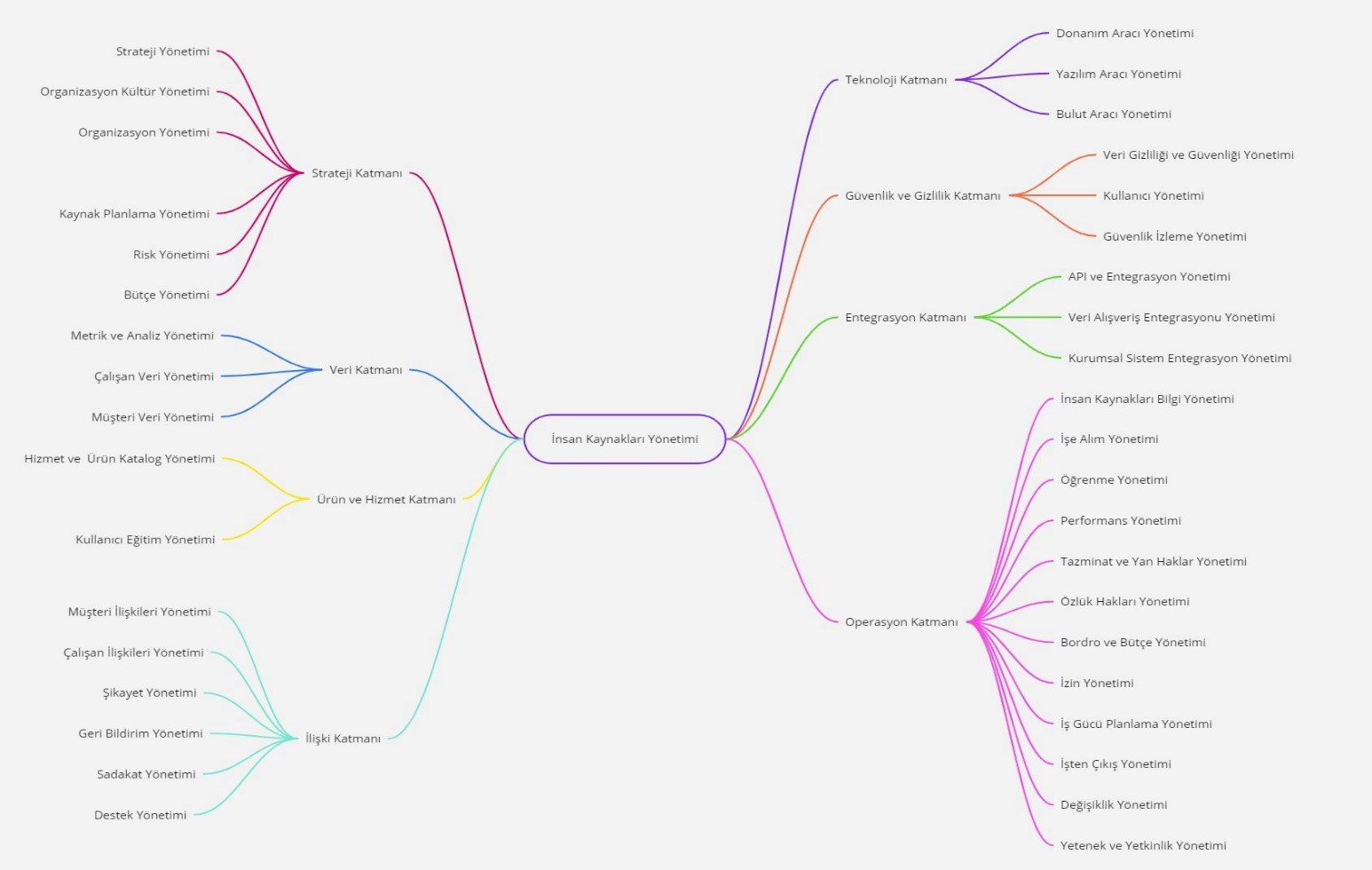 Şekil 3’te verilen zihin haritası, insan kaynakları süreçlerinin birbirinden bağımsız olmadığını ve insan kaynakları yönetiminin tek bir boyuta indirgenemeyeceğini, insan kaynakları süreçlerini oluşturan ve birbirleriyle ilişkili olan farklı fonksiyonel alanları ifade eden strateji, teknoloji, veri, ürün, ilişki, entegrasyon ve operasyon gibi farklı katmanlar üzerinden birbiriyle bağlantılı olduğunu göstermektedir. Her katman, belirli bir odak alanını temsil eder (örneğin, strateji, teknoloji, operasyon) ve bu alanlar bir arada çalışarak insan kaynaklarının bütünsel ve entegre yönetimini sağlar.
