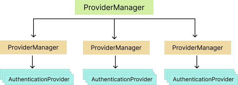 Bir ProviderManager, birden fazla AuthenticationProvider örneğini yönetebilir ve farklı tipte doğrulama tekniklerini bu seviyede de kullanabilir. Bu örneklere, authenticate() metodu ile erişilebilir. Bu metot, kimlik doğrulama işlemini gerçekleştirir. Bu işlem başarılı olursa, Authentication örneği döndürülür. Aksi durumda, AuthenticationException fırlatılır.